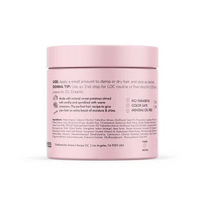 Indulge in Donna’s Recipe Sweet Potato Pie Extra Creamy Hair Cream. It’s a lightweight, buildable non-greasy moisturizing cream that provides superior moisture penetration and soft, touchable definition to curls/waves. Made with sweet potatoes stirred with vanilla and sprinkled with warm cinnamon.
