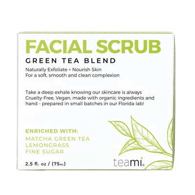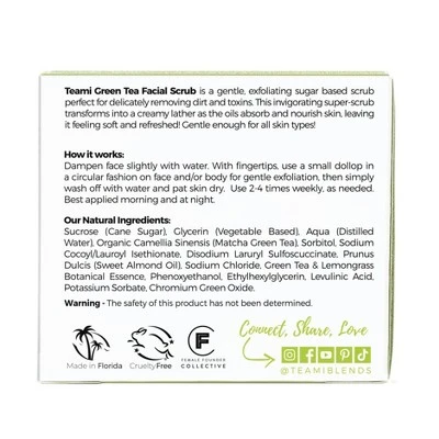 Our super skin brightening Green Tea Facial Scrub will be your new skincare bff! Made with organic matcha green tea, lemongrass and sugar, we formulated this natural exfoliator to be gentle enough for all skin types and buff away unwanted dead skin, without stripping your skin of its’ natural oils.Apply to damp skin using circular motions. Watch the cleansing scrub transform into a creamy lather as the oils absorb and begin hydrate and nourish, leaving the complexion smooth, soft and bright! Our Green Tea Facial Scrub is Cruelty-Free, Vegan, made with Organic ingredients and hand – prepared in small batches, right here in Florida lab! Take a deep exhale knowing you can trust where your skincare products are created, formulated and made! Multi-use: Use as a morning facial cleanser, makeup remover or in the shower for a face or body scrub!
